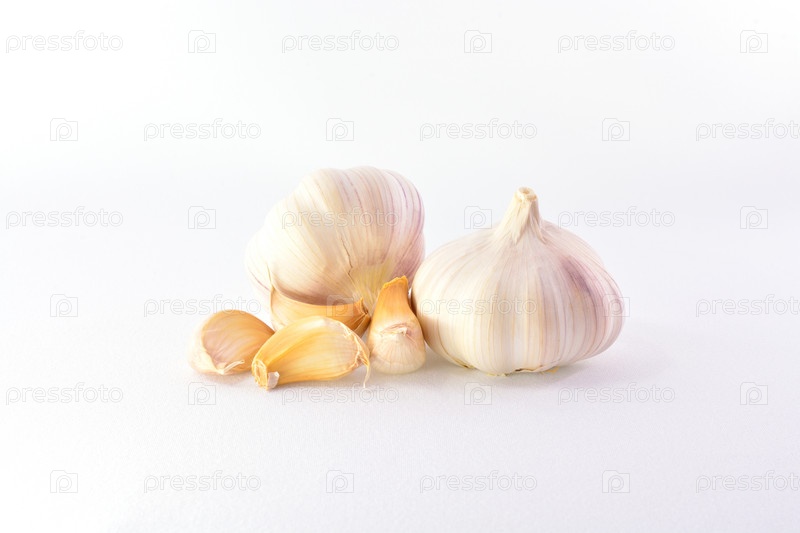 Две головка и зубчики чеснока на белом фоне