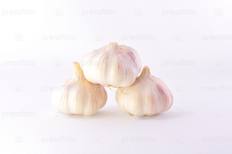 Три головки чеснока на белом фоне