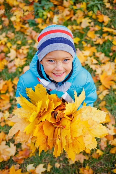 Милый мальчик с осенними листьями