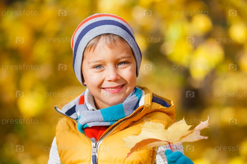 Милый мальчик с осенними листьями