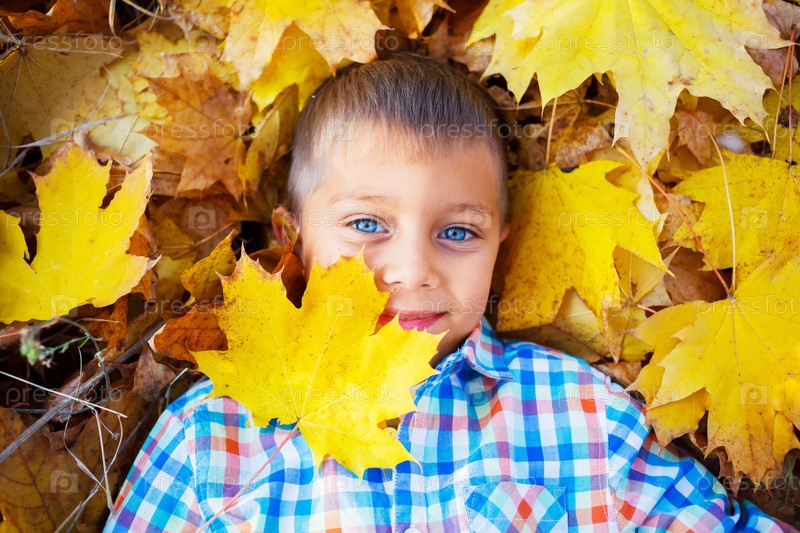 Милый мальчик с осенними листьями