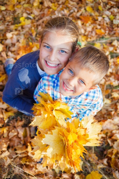 Дети с осенними листьями