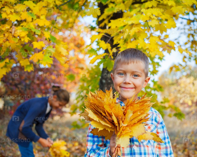Дети с осенними листьями