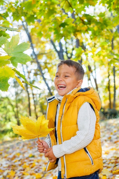 Милый мальчик с осенними листьями
