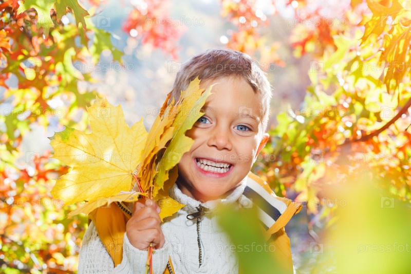 Милый мальчик с осенними листьями