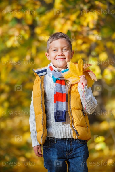 Милый мальчик с осенними листьями