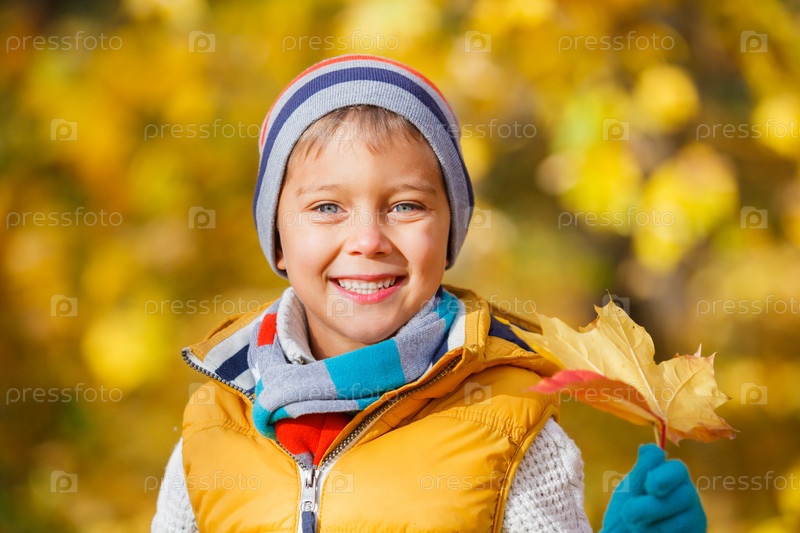 Милый мальчик с осенними листьями