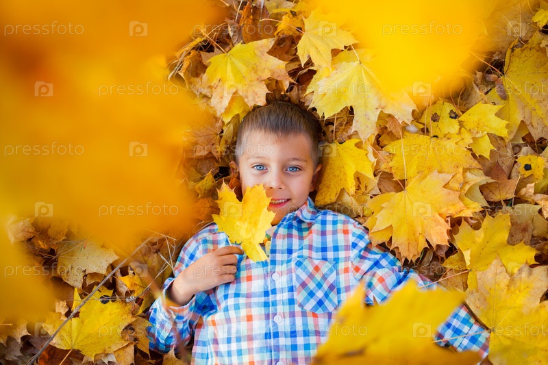Милый мальчик с осенними листьями