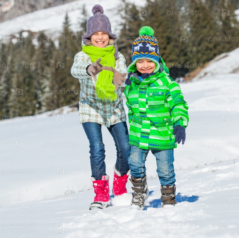 Счастливые дети играют зимой