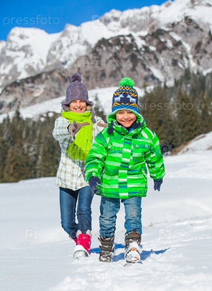 Счастливые дети играют зимой