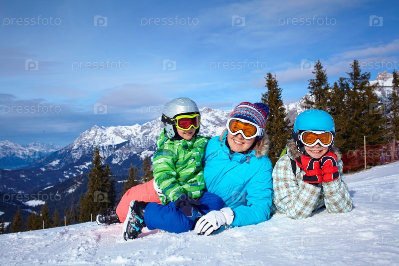 Двое детей с матерью наслаждаются зимними каникулами