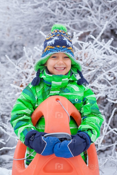 Мальчик катается на санках в зимнем парке
