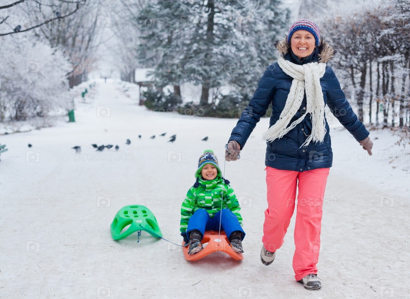 Семья катается на санках в зимнем парке