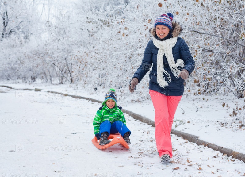 Семья катается на санках в зимнем парке