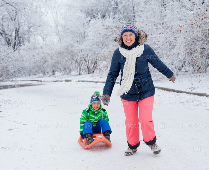 Семья катается на санках в зимнем парке