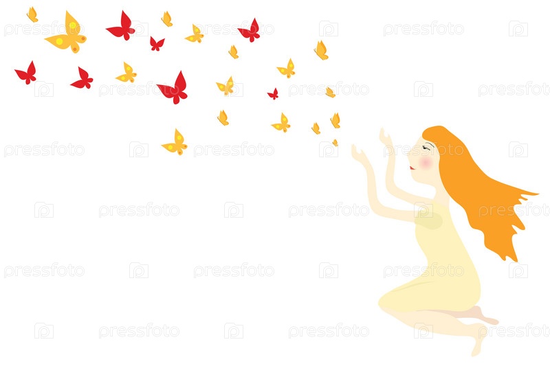 Девушка с бабочками, иллюстрация на белом фоне