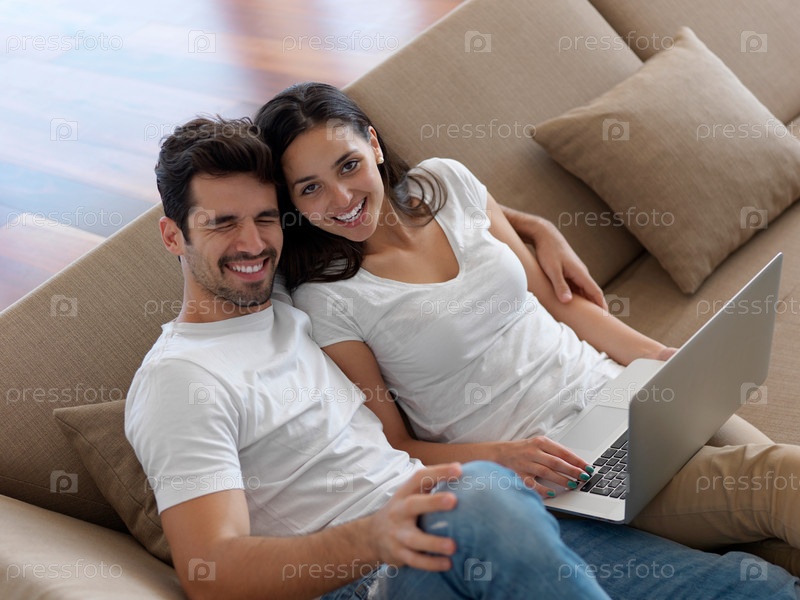 Молодая пара работает на ноутбуке дома