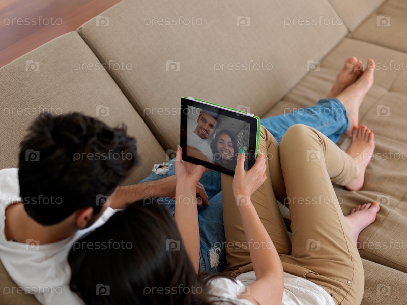 Молодая пара фотографируется дома