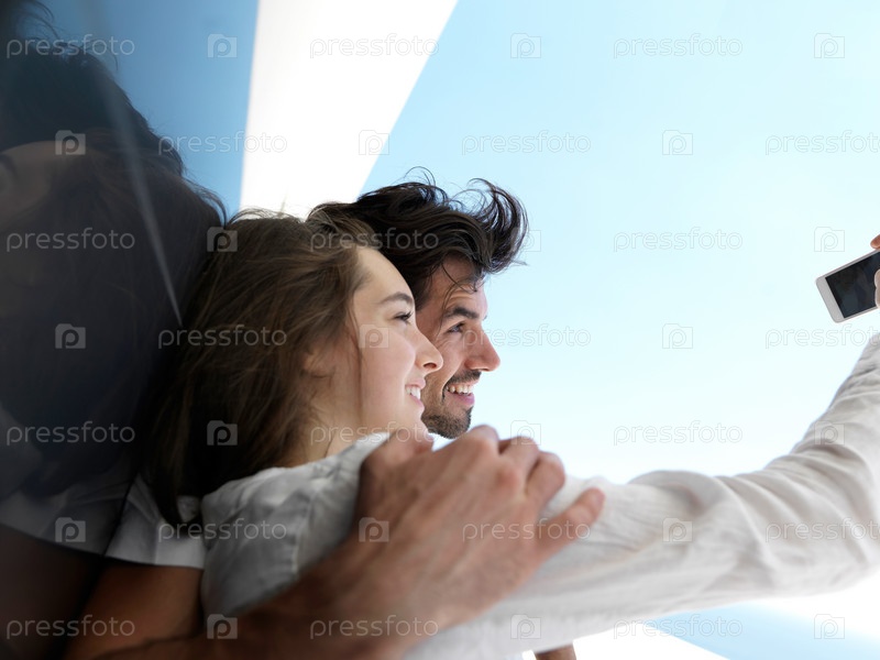 Молодая пара фотографируется дома