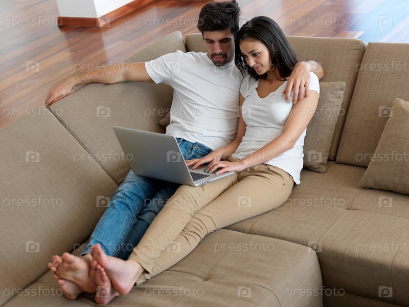 Молодая пара работает на ноутбуке дома