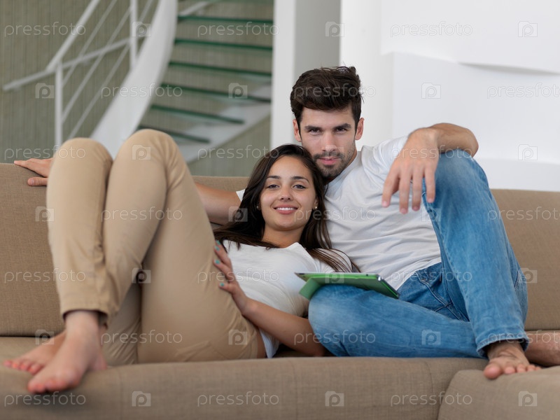 Молодая пара фотографируется дома