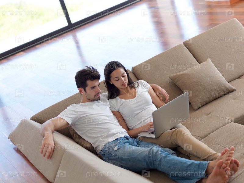 Молодая пара работает на ноутбуке дома