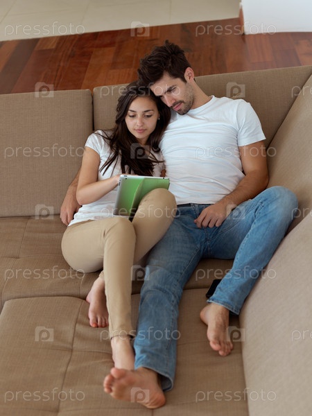 Молодая пара фотографируется дома