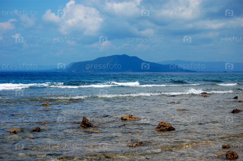Каменистый берег гавани в море, Индонезии