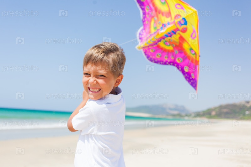 Ребенок запускает воздушный змей на пляже