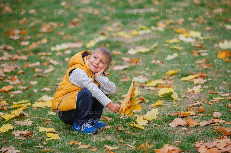 Милый мальчик с осенними листьями