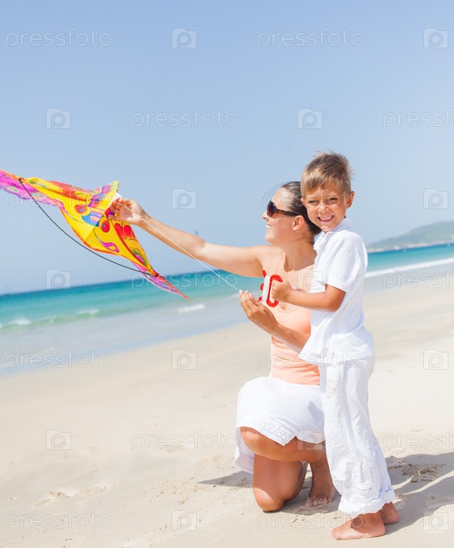 Ребенок запускает воздушный змей на пляже