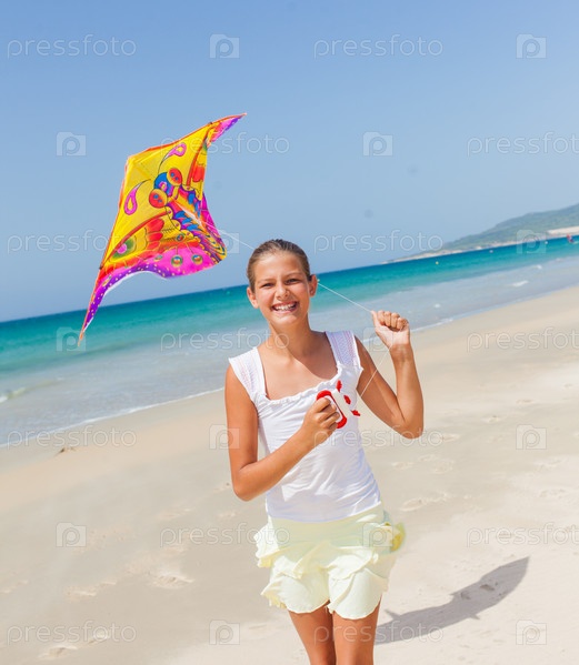 Ребенок запускает воздушный змей на пляже