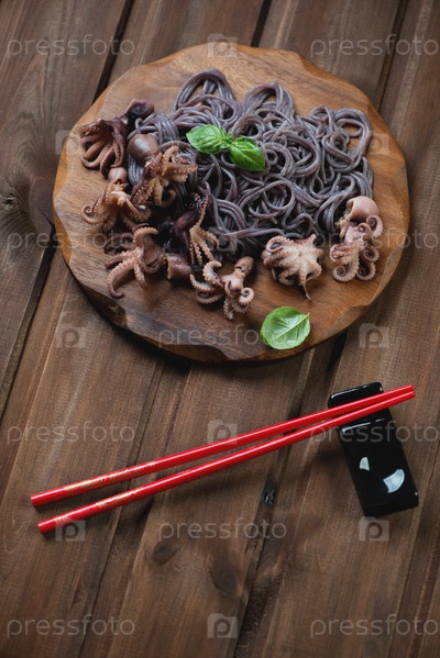 Осьминоги с лапшой из черного риса