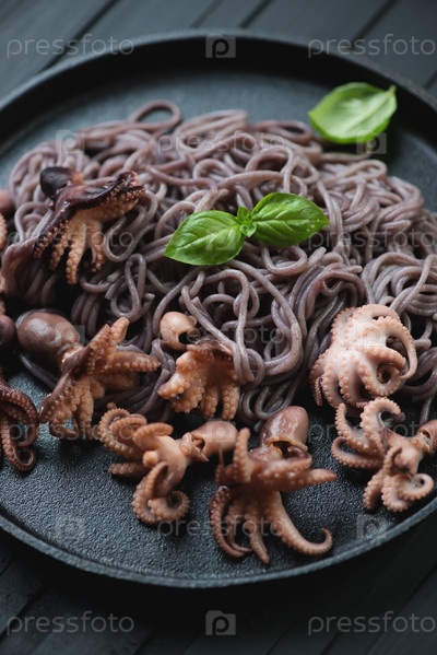 Осьминоги с лапшой из черного риса