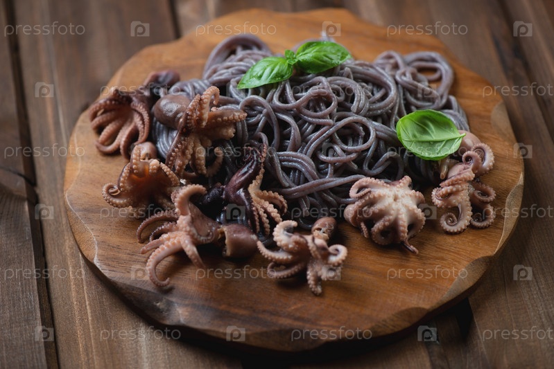 Осьминоги с лапшой из черного риса