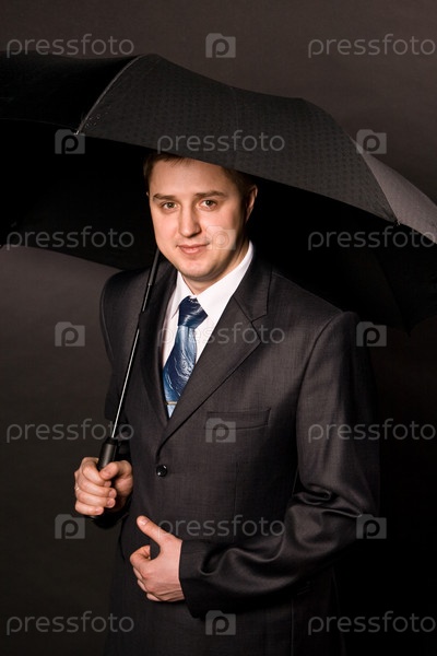 Молодой человек в деловом костюме с зонтом на черном фоне