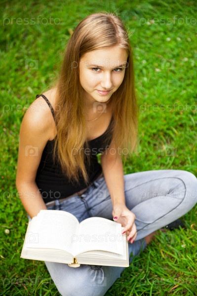 Молодая студентка сидит на траве с книгой