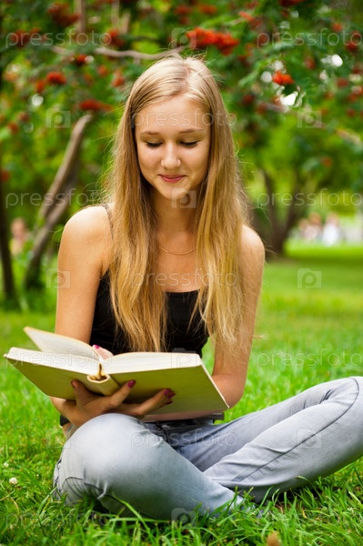 Молодая студентка сидит на траве с книгой
