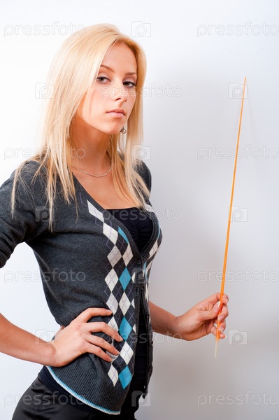 Молодая учительница стоит с указкой возле белой доски