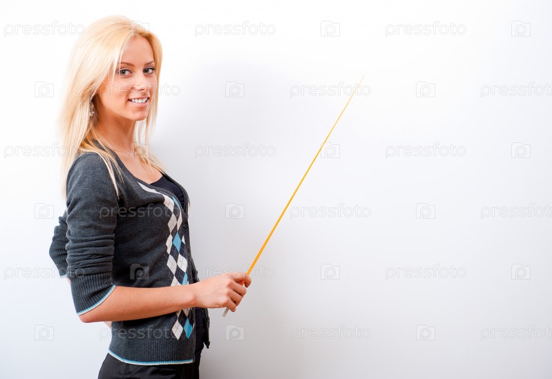 Молодая учительница стоит с указкой возле белой доски