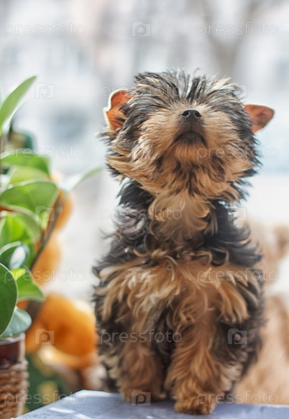 Двухмесячный йоркширский терьер поднял голову