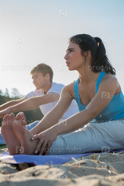 Молодая пара занимается йогой