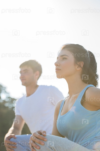 Молодая пара занимается йогой