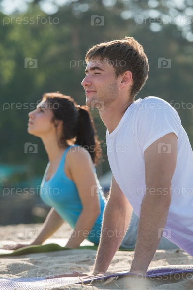 Молодая пара занимается йогой