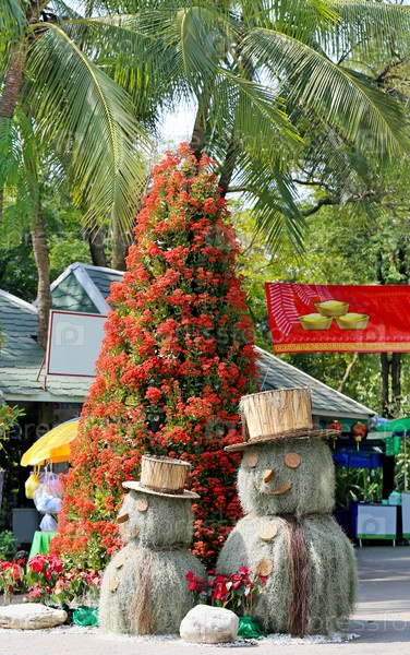 Цветущее дерево и фигуры снеговиков
