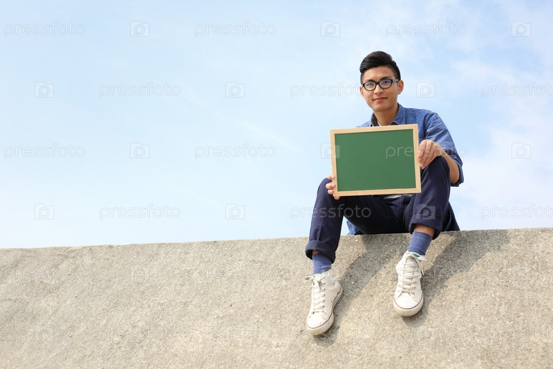 Счастливый мужчина с доской для написания текста