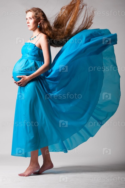 Беременная женщина стоит на сером фоне в развевающемся голубом платье