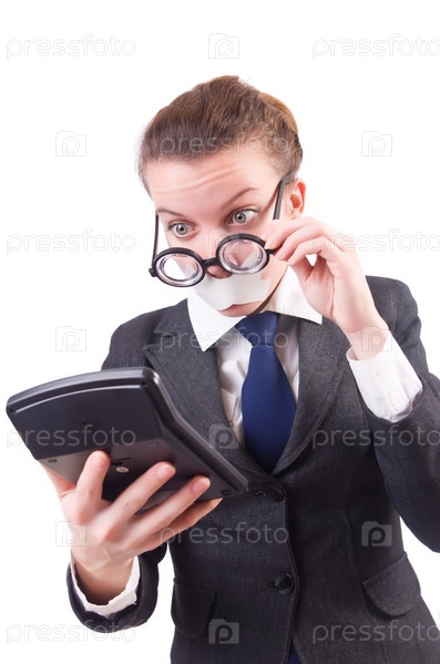 Бизнес-леди с калькулятором и заклеенным ртом