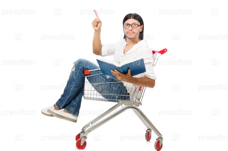 Мужчина в корзине для покупок