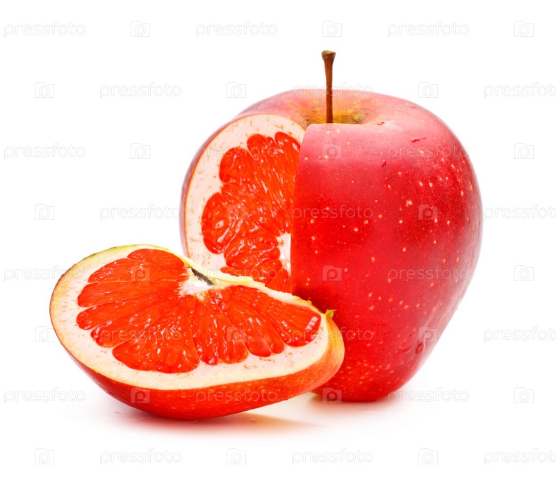 Красное яблоко с мякотью грейпфрута на белом фоне